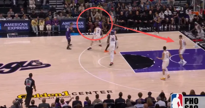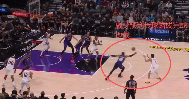 格林突破被阿丘瓦协防逼停后就近出球给弧顶空位的布克,威少预判其传球意图后迅速上前单手完成抄截。