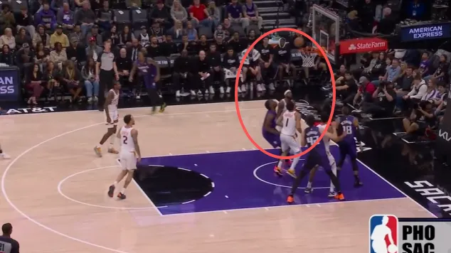 见雷诺抛投不中,阿丘瓦趁太阳篮下球员不备直接高高跃起,双手将球砸进篮筐,完成补扣。