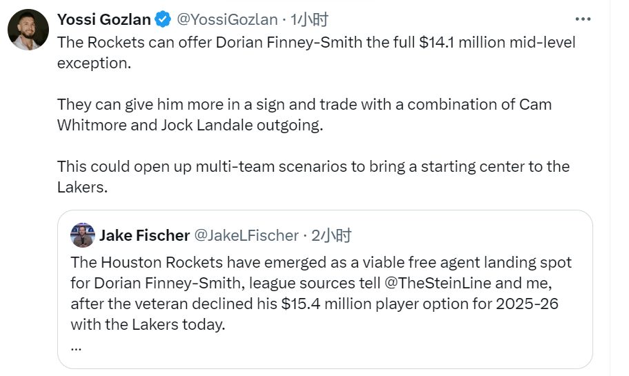 根据NBA记者约西·戈兹兰的报道,火箭可以给芬尼-史密斯高于全额中产的合同,方式是先签后换,筹码包括惠特摩尔和兰代尔。这可能需要多方交易,从而为湖人带来一位首发中锋。