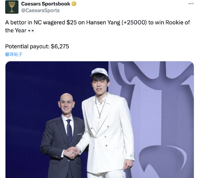 虽然杨瀚森一场NBA比赛还没打,但外界对他的预期在逐渐提升。一周前,杨瀚森在年度最佳新秀赔率榜上的排名是并列第27位,赔率是+25000。当时有报道称,一位北卡州的球迷买了25美元的杨瀚森当选最佳新秀,如果实现,他将收回6275美元。